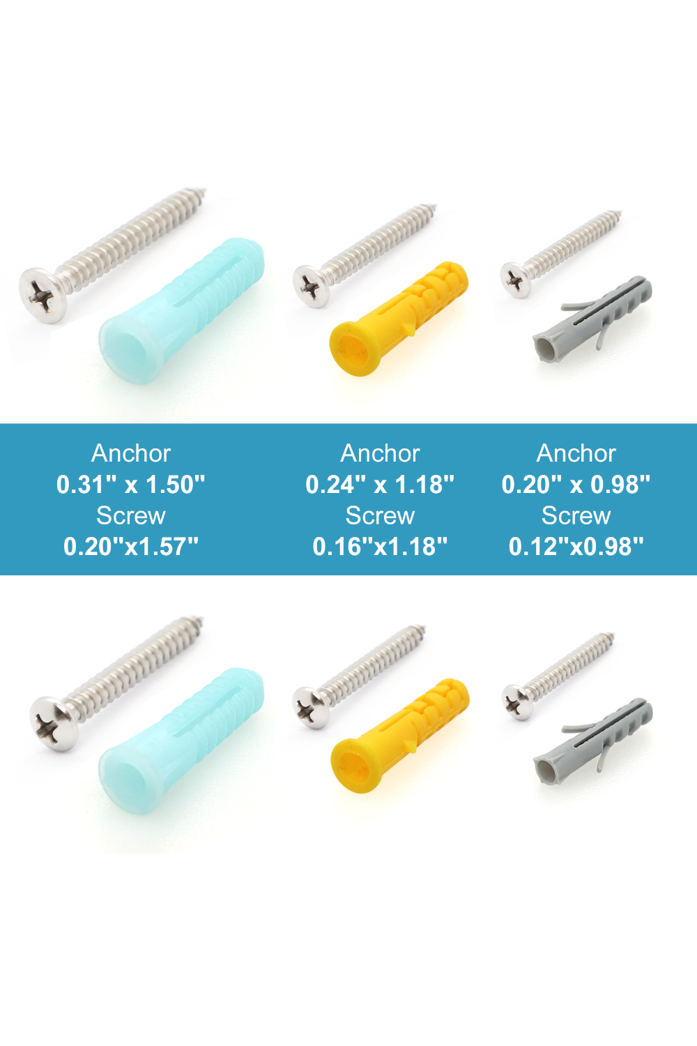 - [Screws with anchors drywall set] Includes 216 drywall screws and 216 drywall anchors. Offering anchor sizes of 0.20" x 0.98", 0.24" x 1.18", and 0.31" x 1.50", paired with corresponding screws of 0.12"x0.98", 0.16"x1.18", and 0.20"x1.57".